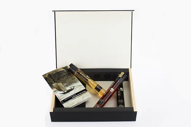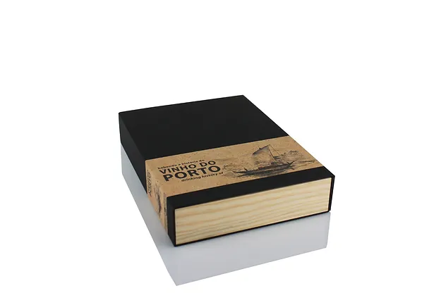 Coffret em madeira conjugada com cartão compacto forrado a finepaper preto e estampagens a ouro