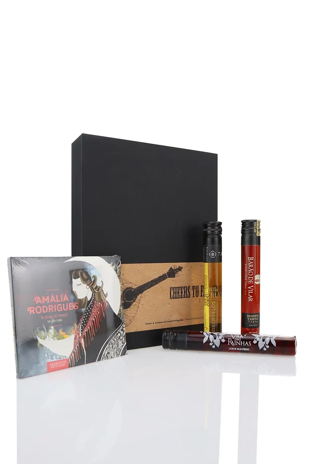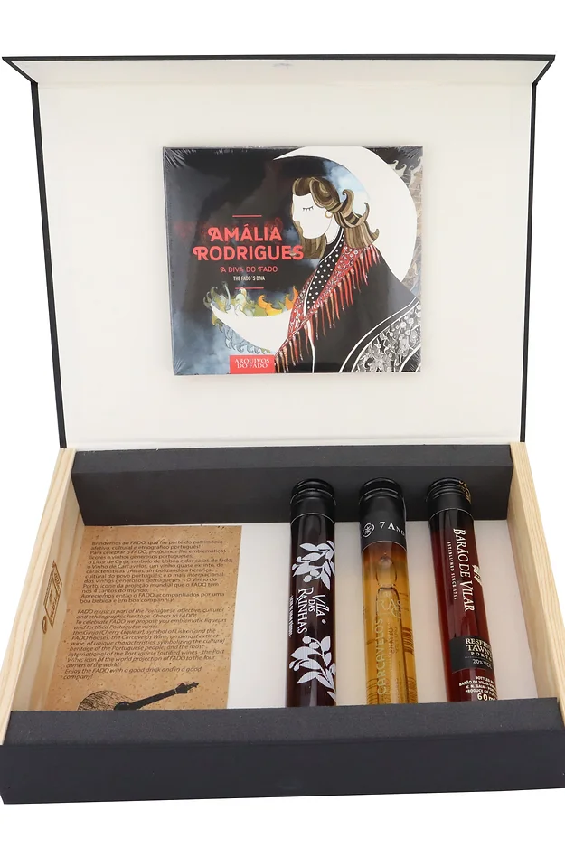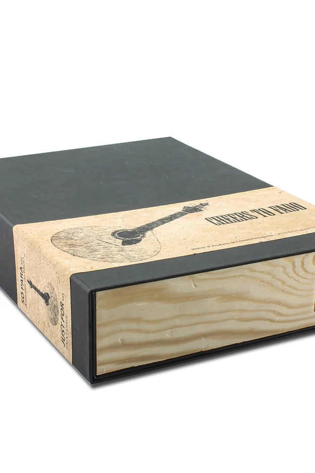 Coffret em cartonado rígido forrado a papel preto e com topos em madeira