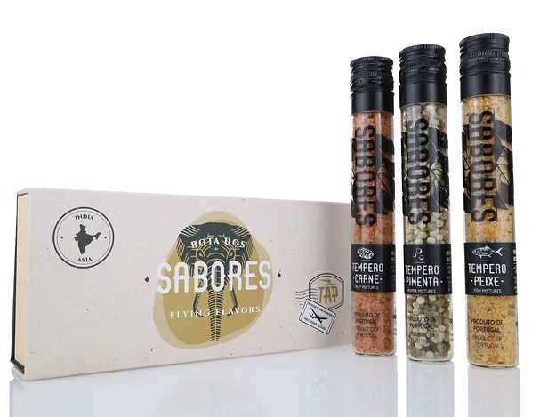 Coffret composto por três tubos de especiarias: tempero peixe, tempero carne e tempero pimenta. A conquista da cidade de Ceuta, no norte de África, marca o inicio das expansões marítimas Portuguesas em 1415. A rota marítima para a Índia, contornando África pelo Cabo da Boa Esperança, foi descoberta em 1497 por Vasco da Gama, e transformou-se numa importante rota de comércio de especiarias. Essa herança ancestral fez enriquecer a gastronomia portuguesa com condimentos de sabor inigualável, que hoje fazem parte integrante da cultura local. Para partilhar essa experiência juntamos neste coffret 3 tubos repletos de sabores!