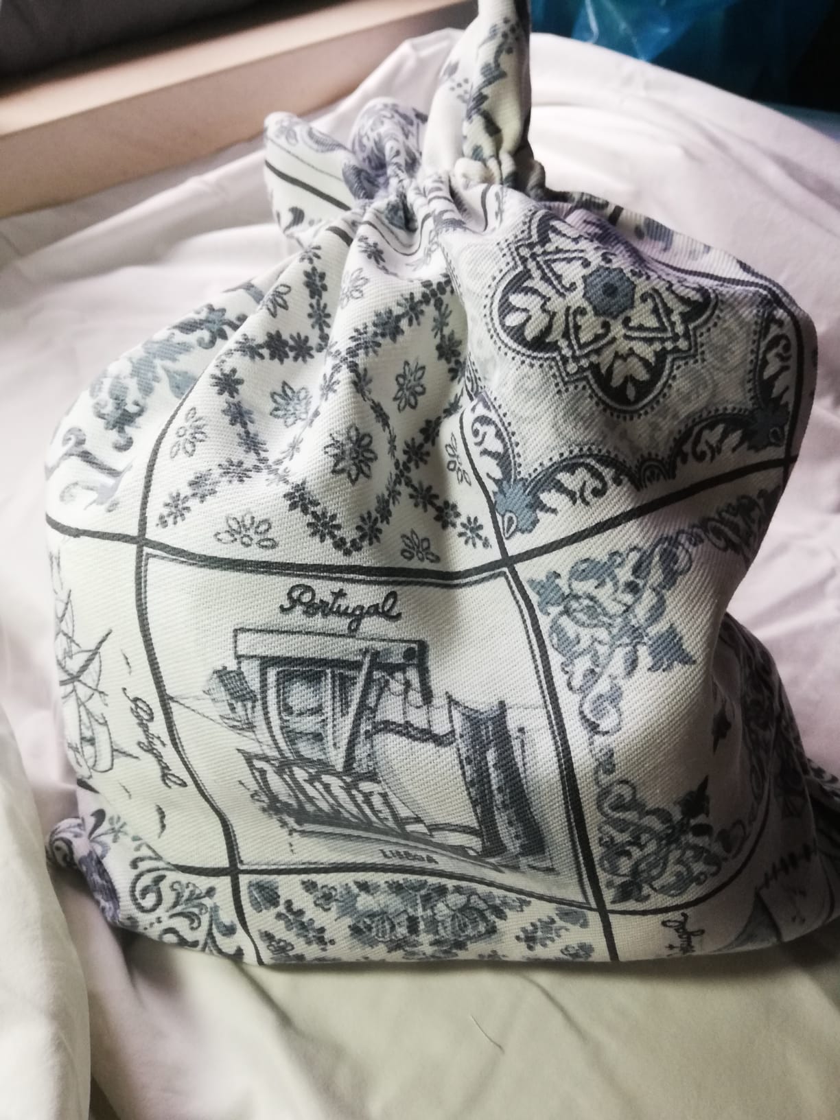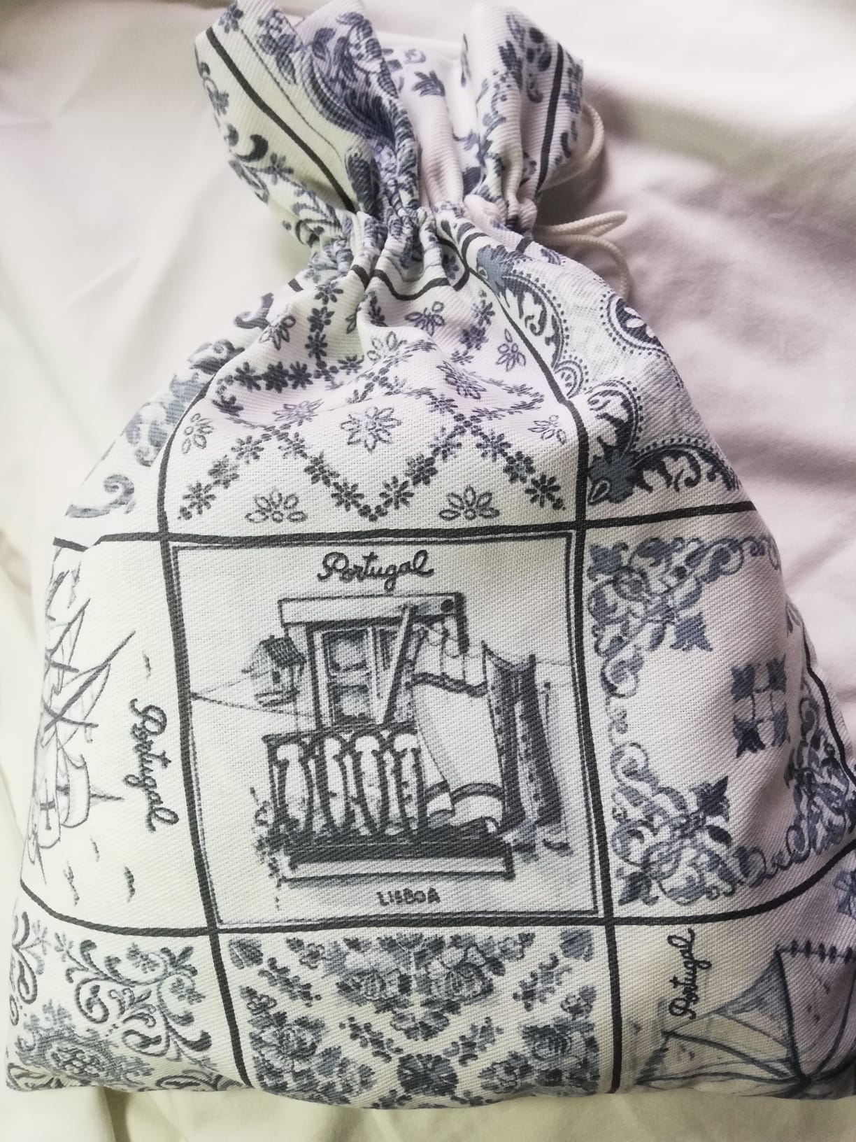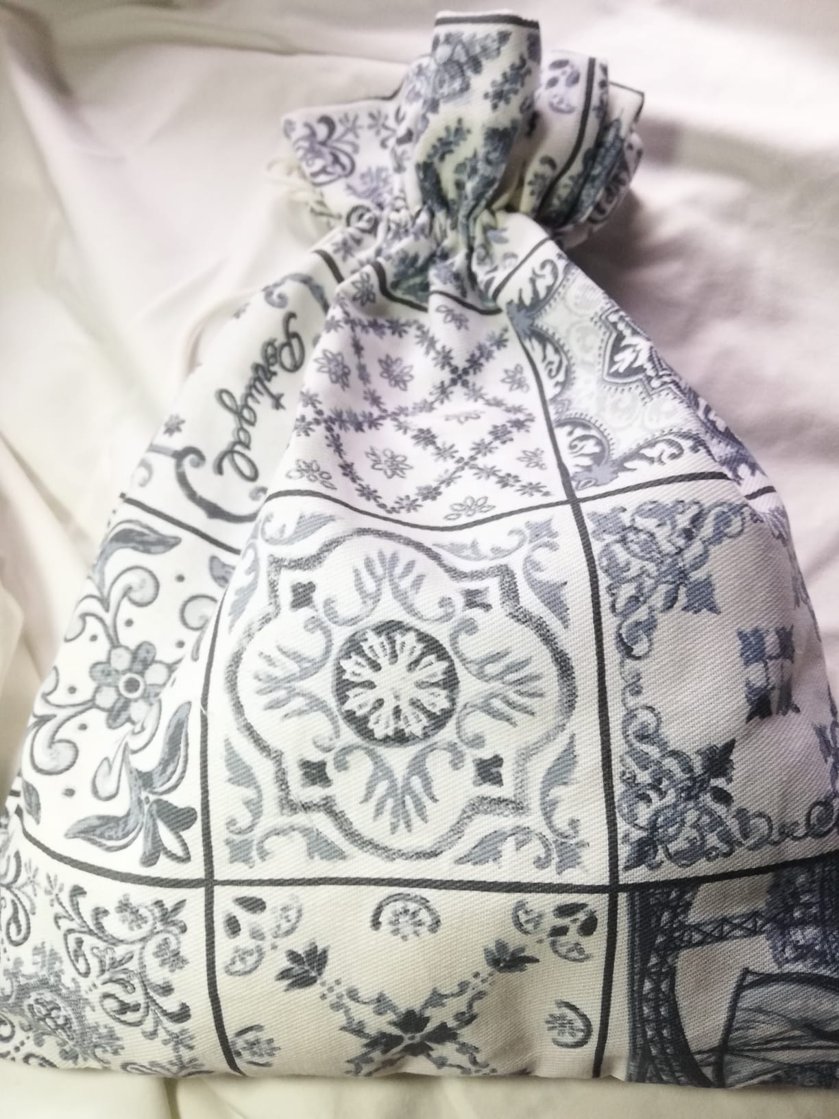 Saco 100% algodão cozido à mão destinado a reservar o pão de casa para que se mantenha fresco por mais tempo.