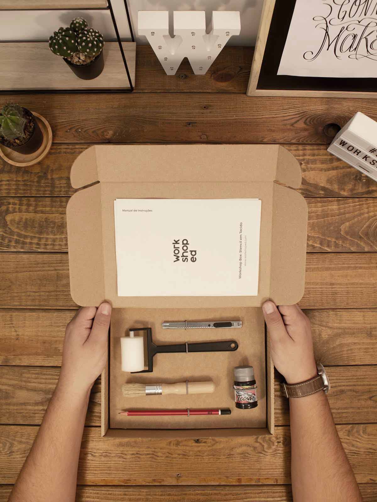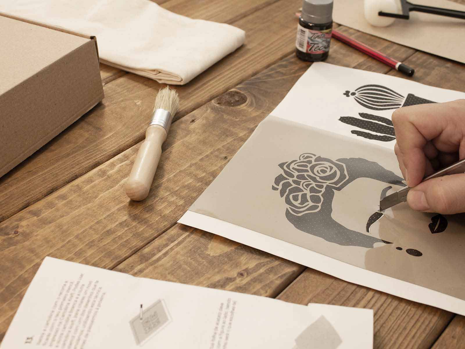 Neste workshop de stencil vais aprender como recortar e aplicar um stencil num tecido. Pode parecer fácil, mas para dominar esta técnica é preciso algum conhecimento e prática. É exatamente para isto que esta nossa box serve!